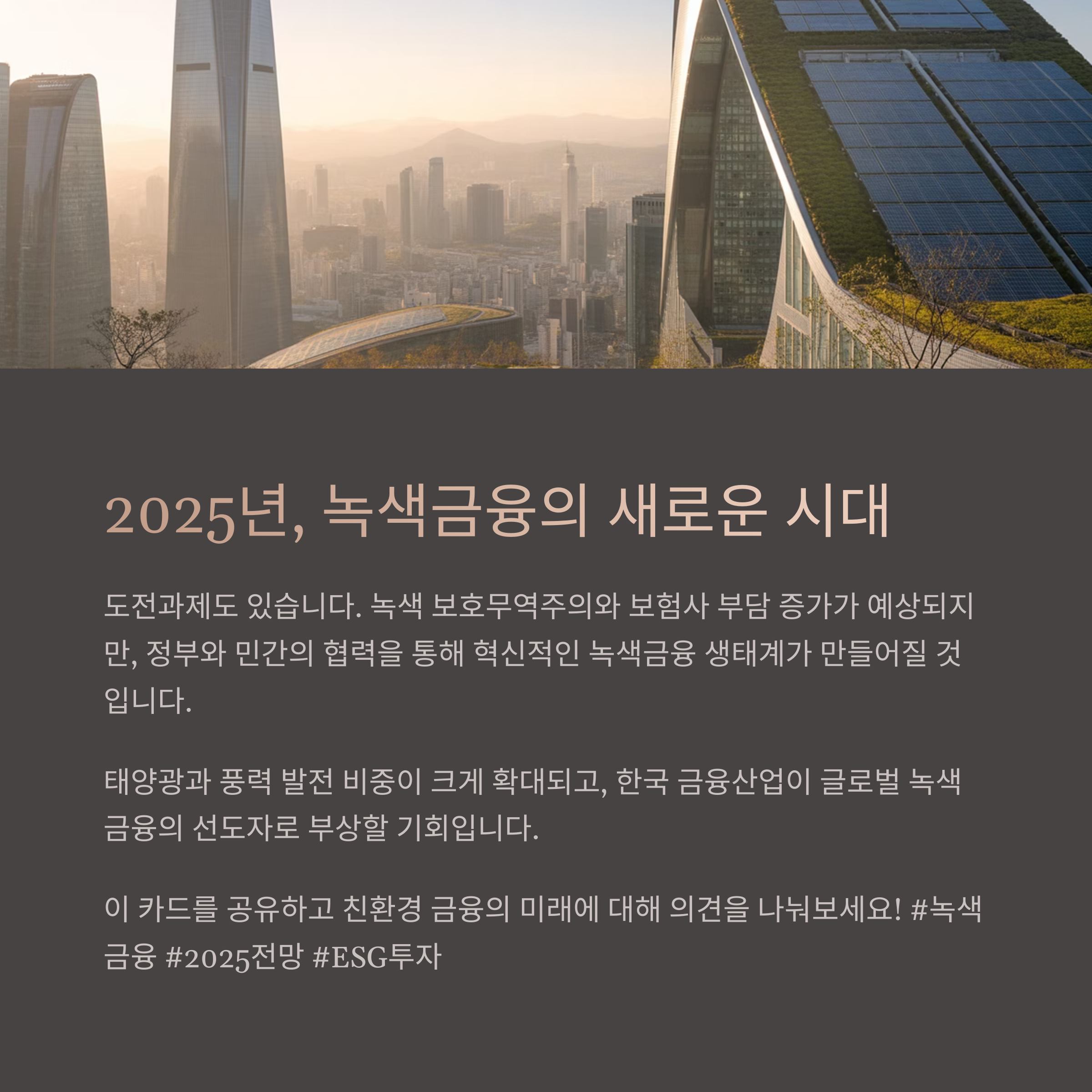 2025년은 녹색금융이 본격적으로 확장되고 내실을 다지는 중대한 해로 평가받고 있어요. 특히, 환경·사회·지배구조(ESG)와 밀접하게 맞물리며, 정부 정책, 시장 메커니즘, 기술 혁신의 세 가지 요소가 동시에 작용합니다. 이러한 변화는 금융 시장에서 자금 조달 방식과 투자 우선순위를 근본적으로 바꿀 것으로 기대돼요. 녹색 금융이 주목받게 되면, 재생 에너지에 대한 투자와 같은 친환경 프로젝트가 보다 많은 관심과 자금을 받을 수 있게 됩니다. 이를 통해 기업과 투자자들은 지속 가능한 성장과 수익을 동시에 추구할 수 있는 발판을 마련하게 될 것입니다. 예를 들어, 태양광 발전이나 전기차 충전 인프라 확대에 대한 투자는 기업의 비용 절감과 동시에 환경에도 긍정적 영향을 미치게 되죠. 이러한 변화가 우리 일상에도 큰 영향을 미칠 것이란 점에서 2025년은 매우 중요하다고 할 수 있겠습니다. 🏦🌿
