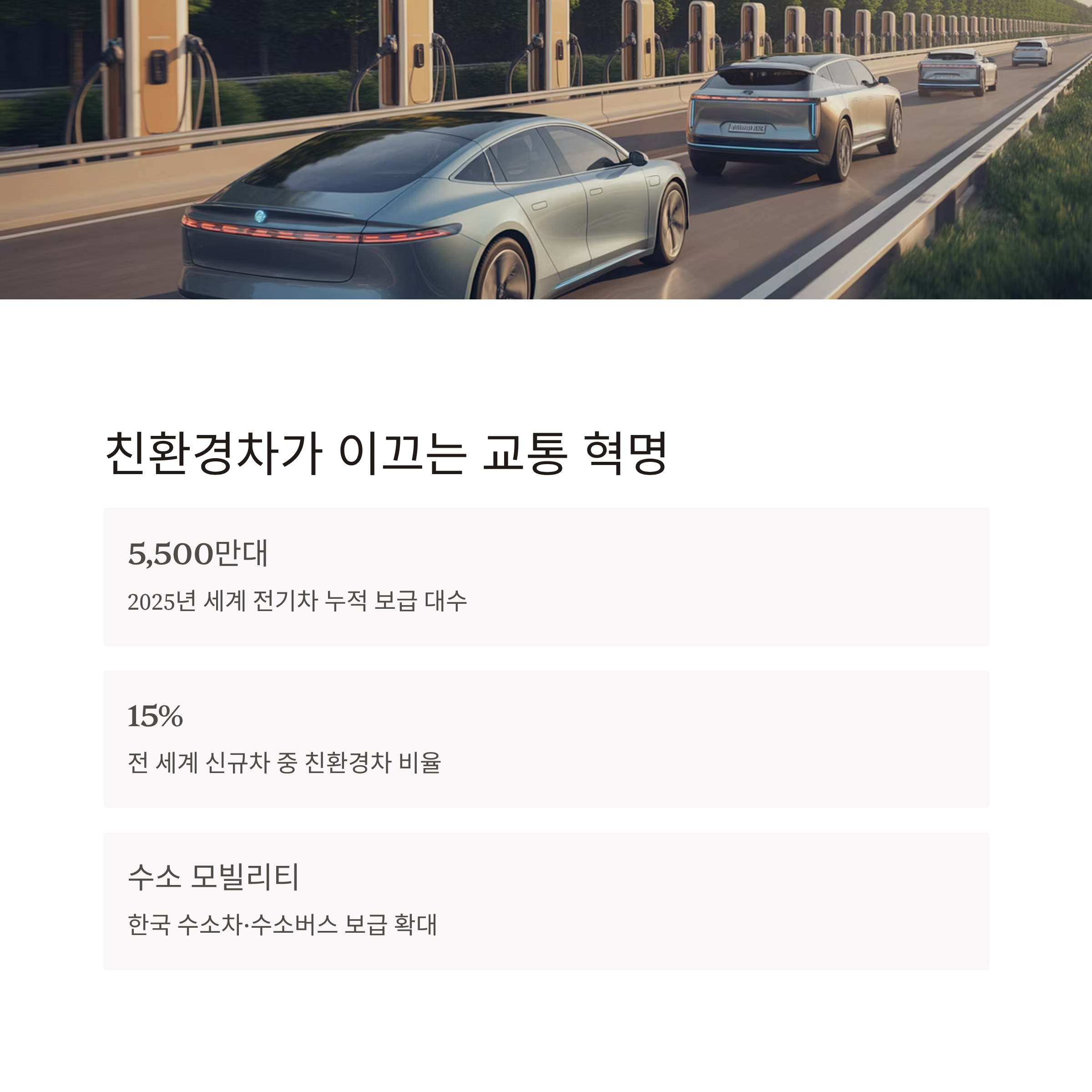교통 부문에서는 친환경 전환이 가속화되고 있어요. 전기차, 수소차 등이