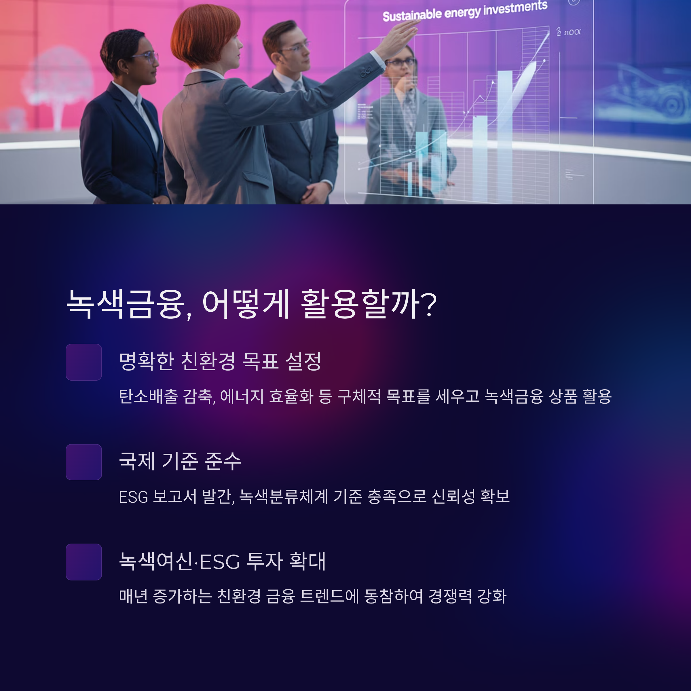 - 녹색 프로젝트 진행 시 금융기관과 협력