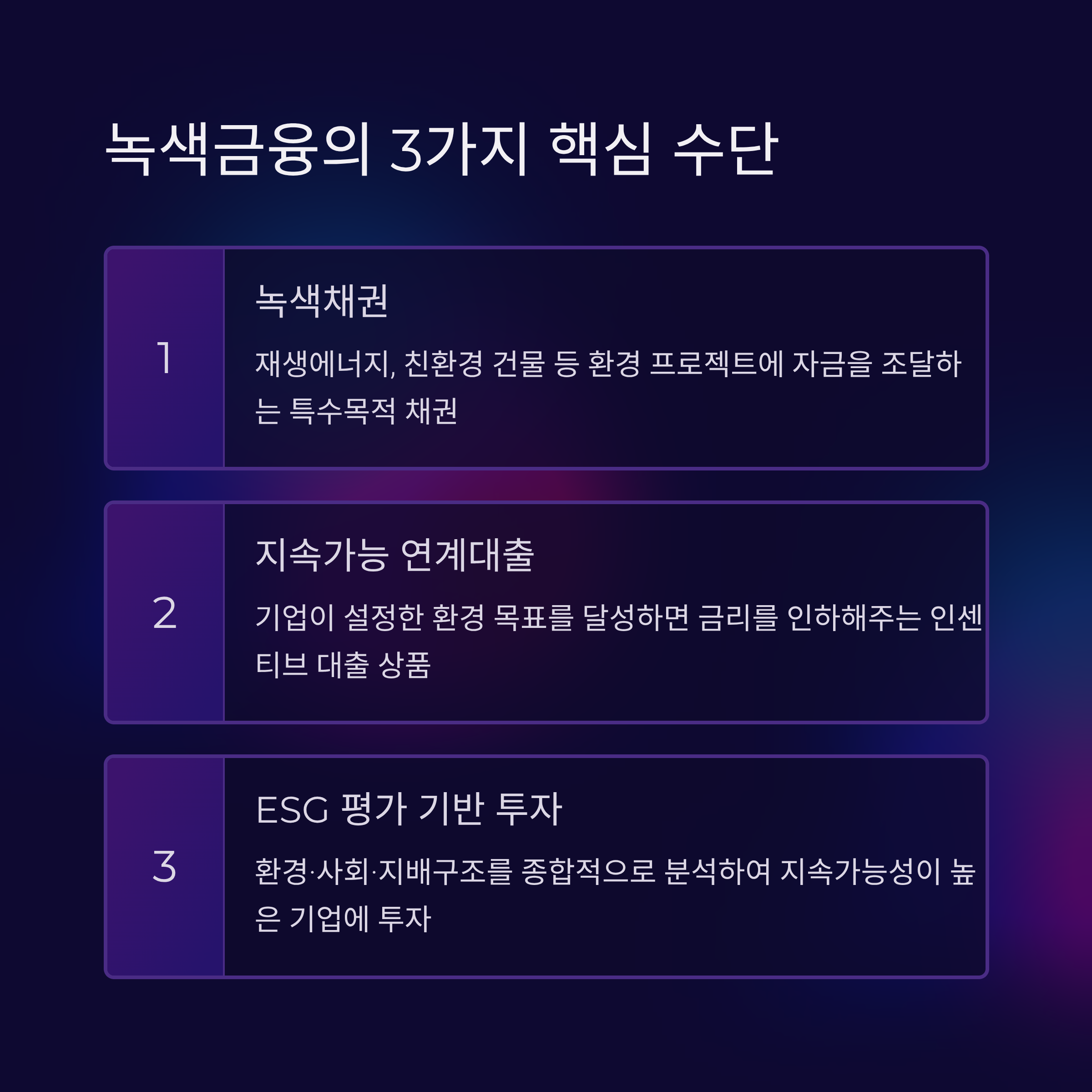 녹색금융은 최근 몇 년간 급격히 성장하며 환경 보호와 지속 가능한 발전을 위한 핵심 수단으로 자리매김하고 있습니다. 기본적으로 녹색금융은 기후 변화에 대응하고 환경에 긍정적인 영향을 미치는 프로젝트를 지원하는 모든 금융 활동을 포함합니다. 이러한 금융 활동은 매우 다양하고 복잡하지만, 크게 몇 가지 핵심 수단으로 나눌 수 있습니다. 녹색채권, 지속가능 연계대출, 그리고 친환경 기술 투자가 그 예입니다. 예를 들어, 녹색채권은 조달된 자금을 재생에너지 프로젝트나 에너지 효율화에 사용할 수 있도록 한정하죠. 그런 점에서, 녹색금융은 기존 금융과는 달리 환경적, 사회적 가치를 창출하기 위한 도구로 인식되고 있습니다. 📈
