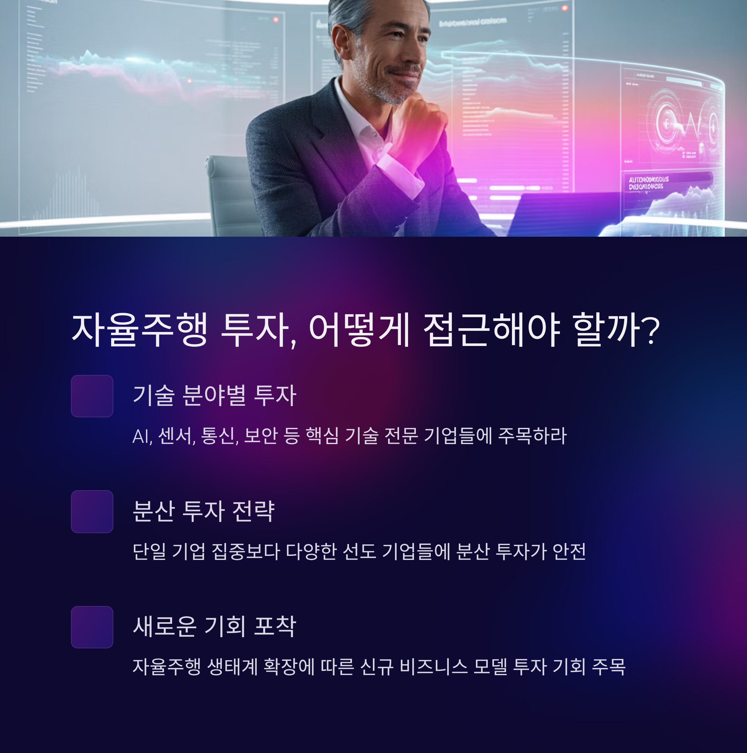 주요 자율주행 기술 기업 주식에 투자하거나 관련 상장지수펀드(ETF)를 활용할 수 있습니다. 또, 하드웨어 및 소프트웨어 핵심 부품 공급업체에도 기회가 열려 있습니다. 중요한 것은 특정 기술이나 업종에 집중하기보다 포트폴리오를 다각화하여 시장 변동성에 대비하는 것이죠.