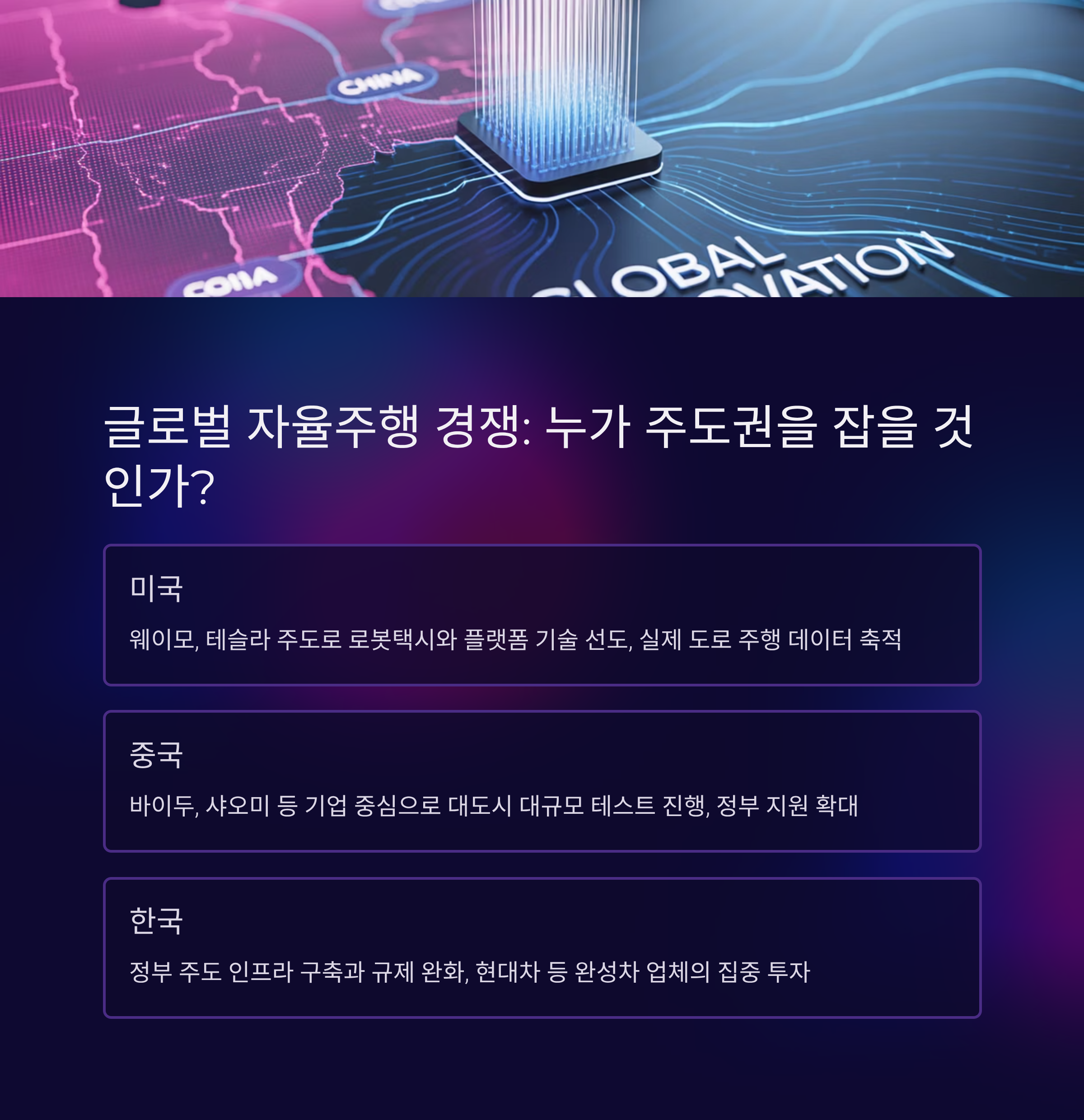 - 중국은 바이두(Baidu)와 BYD와 같은 기업을 지원하며, 자율주행 시범지구를 통해 산업 발전을 도모합니다.