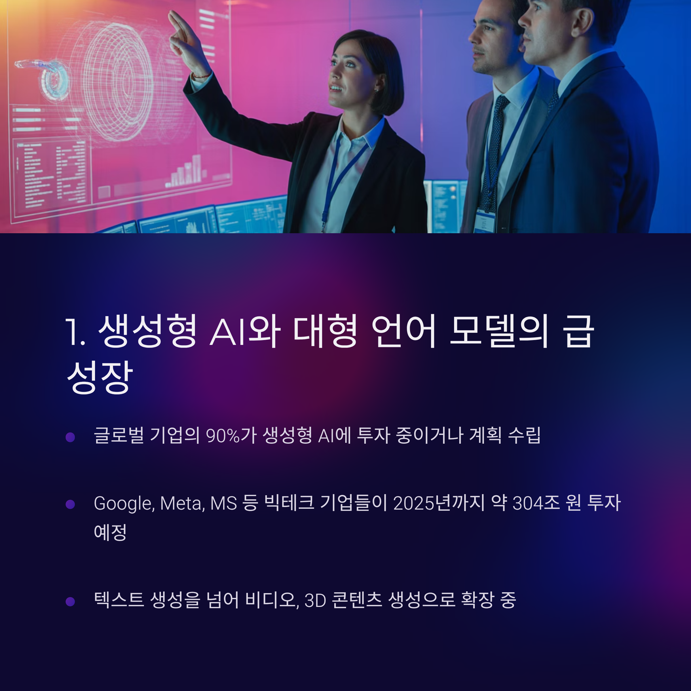 생성형 AI와 LLM(대형 언어 모델)은 2025년에도 투자자들에게 크게 주목받고 있는 분야입니다. 이 기술들은 이미 많은 기업에서 머신러닝 연구의 핵심으로 자리 잡았어요. 이를 통해 얻어지는 데이터 수익 창출의 기회가 늘고 있는 것이죠. 빅테크 기업들이 2,500억 달러 이상의 자본을 이 분야에 투자하겠다고 밝히면서, AI 관련 인프라와 솔루션에 대한 자본 집중이 확대되고 있는 추세입니다. 특히, Microsoft와 Google은 이러한 AI 기법을 자사의 제품 개선 및 신뢰성을 높이는 도구로 활용하고 있으며, LLM을 기반으로 한 새로운 비즈니스 모델을 적극적으로 모색 중입니다. 이로 인해, AI 벤처에 대한 투자도 더욱 강화되고 있습니다. 대형 언어 모델의 발전 뿐만 아니라 작은 스타트업들의 혁신적인 기술도 적극적으로 활용되어, 기존의 비즈니스 방식에 혁신을 가져올 가능성이 크답니다.