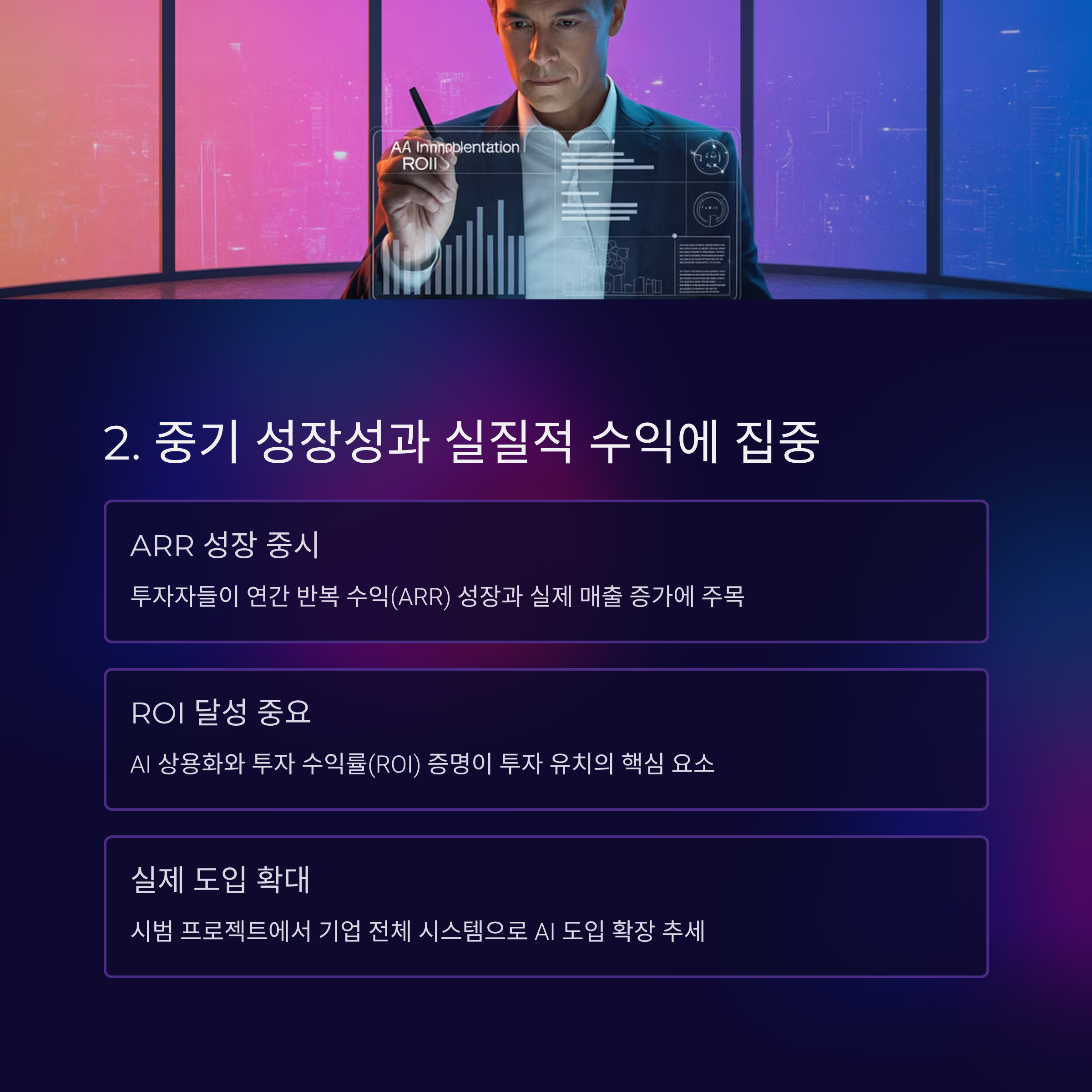 최근 중기적으로 ARR(연간 반복 매출)과 실질 수익성에 초점을 맞춘 투자자들이 늘어나고 있습니다. AI 산업에서도 비슷한 방향성이 관측되고 있어요. 단지 기술의 발전 가능성에만 의존하는 것이 아니라, 실제 매출 성장과 이익 실현까지 명확한 로드맵이 마련된 기업이 주식 시장에서 높은 평가를 받고 있습니다. 2025년에는 AI 기업들의 평균 밸류에이션이 10~20배 수준으로 조정되면서 더욱 현실적 평가가 이루어지고 있답니다.