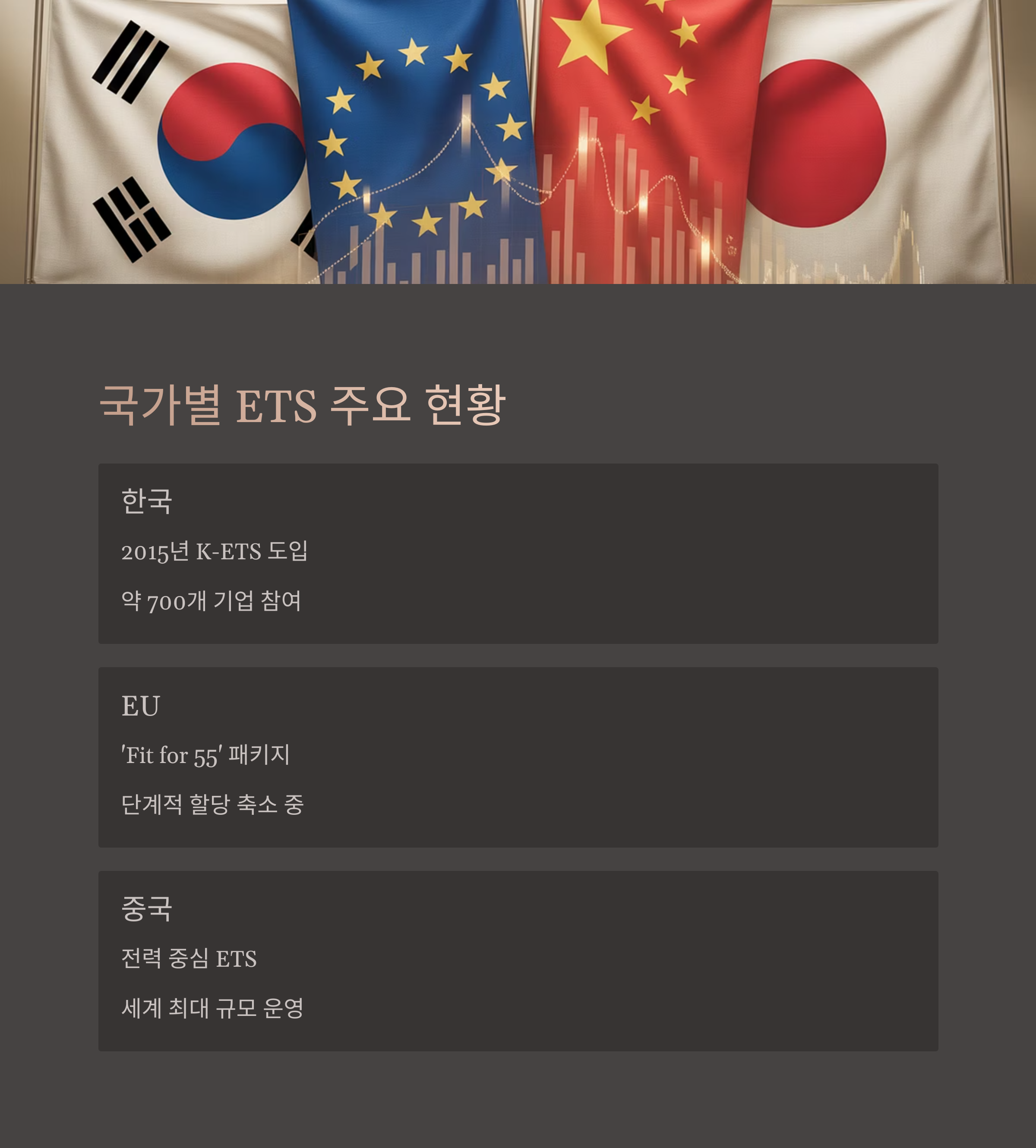 최근 몇 년 동안, 탄소배출권 거래제의 도입과 정책 변화가 전 세계적으로 활발히 일어나고 있습니다. 대표적인 사례로 유럽연합(EU) ETS와 한국의 K-ETS을 들 수 있습니다. 유럽연합은 'Fit for 55'라는 목표 아래 배출권 할당량을 점진적으로 줄여가고 있고, 한국 역시 할당량 축소 정책을 통해 기업의 자발적인 탄소 감축을 유도하고 있습니다. 무엇보다 산업 내 무상할당의 점진적인 축소가 기업들에게 큰 영향을 미치고 있습니다. 이는 탄소 가격 상승으로 이어지게 되어 기업의 운영 비용 상승으로 이어지기도 합니다. 그렇기에 각국은 이러한 변화를 체감하며, 자국 산업의 경쟁력을 유지하고 탄소 배출을 실질적으로 줄이고자 다양한 정책 및 기술 혁신을 추진 중입니다. 😊 이러한 변화를 주도하는 정책들은 단순히 규제에 그치지 않고 새로운 시장의 기회를 창출하기도 하며, 기업들의 자발적 참여를 유도하게 됩니다.