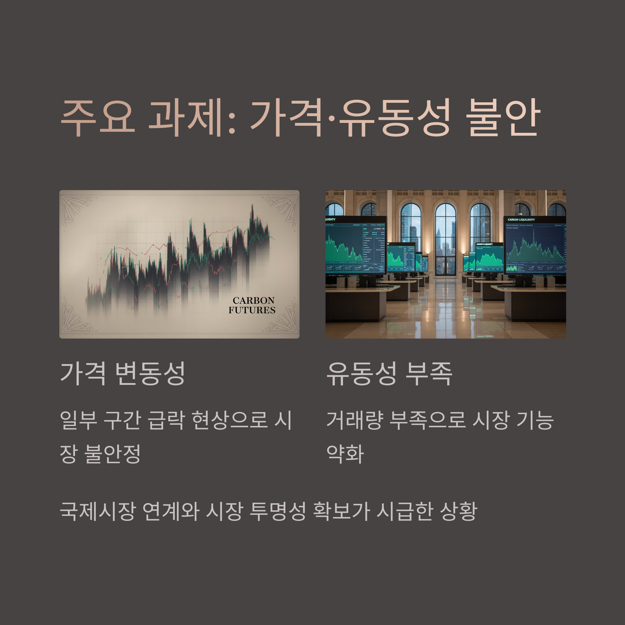 탄소배출권의 가격 변동성은 다양한 요인에 의해 발생합니다. 이를 해결하기 위해 할당량 이월 제도를 유연화하거나, 시장 참여자에게 데이터를 투명하게 공개하여 신뢰성을 높입니다. 또한, 탄소배출권 거래를 위해 충분한 유동성을 유지하고, 시장 활성화 정책을 통해 변동성을 억제하고자 합니다.