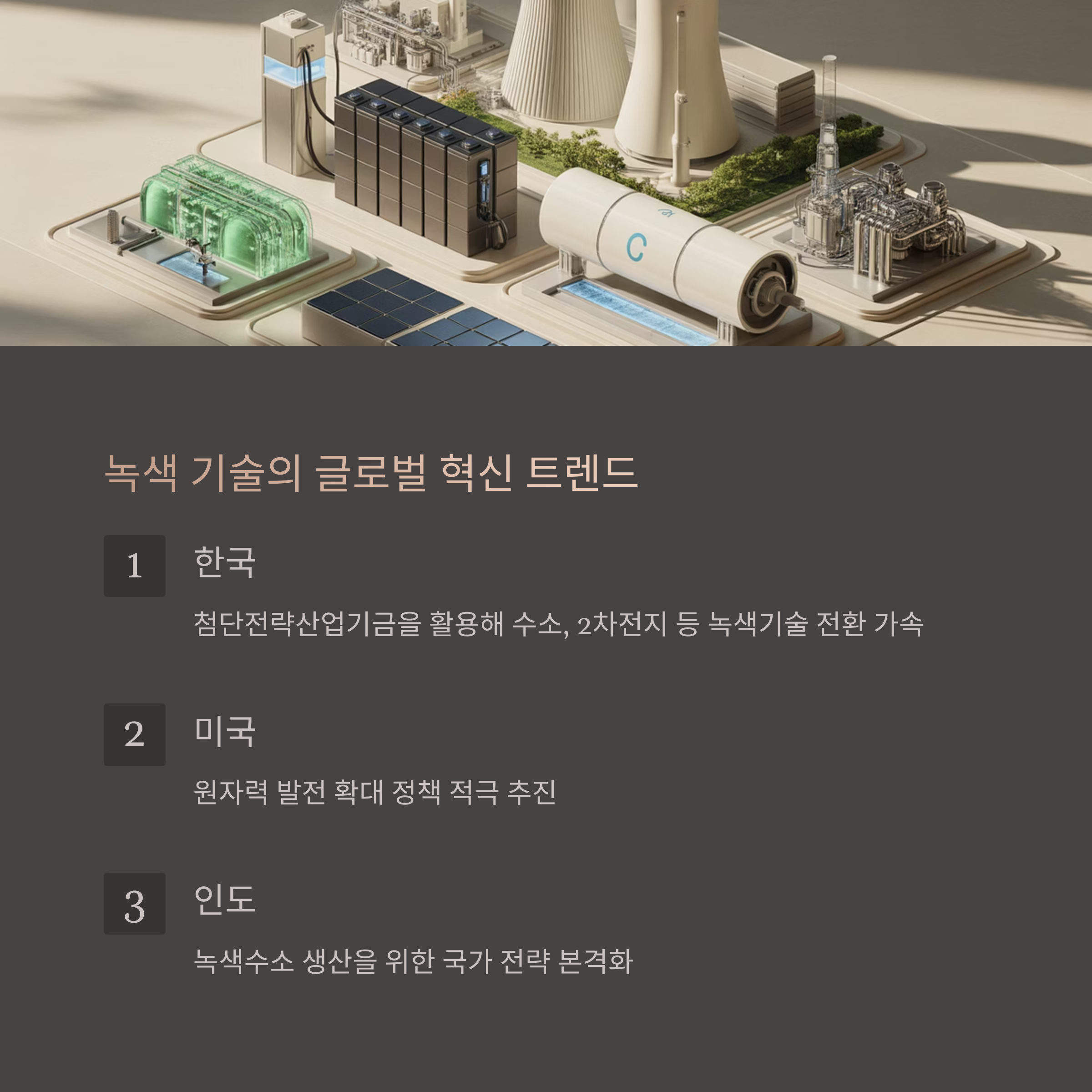 글로벌 차원에서 저탄소 경제로의 전환이 활발히 이루어지고 있습니다. 특히, 녹색 기술 및 재생에너지 분야에 대한 투자가 대폭 늘어나고 있습니다. AI, 고효율 인프라, 데이터센터의 무탄소 전력 사용 등이 주요 트렌드로 자리잡고 있습니다. 그리고 재생에너지의 확산은 글로벌 에너지 시장의 범위를 넓히고 있습니다. 다음은 현재 주목할 만한 글로벌 동향을 정리한 리스트입니다.