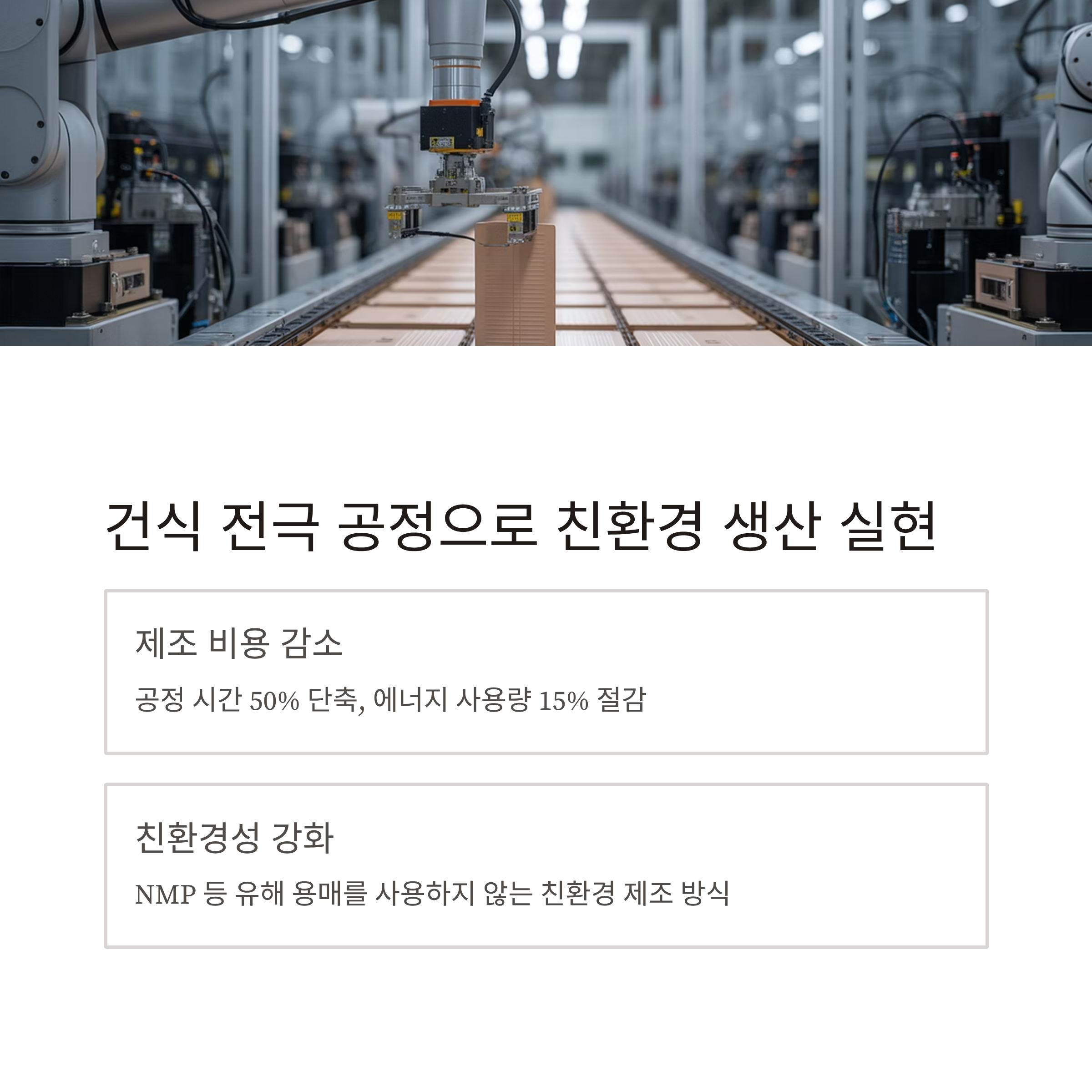 자원이 소모되곤 했죠. 하지만 건식 전극 공정에서는 이러한 단계가 모두 제거되어 더 짧은
